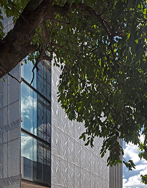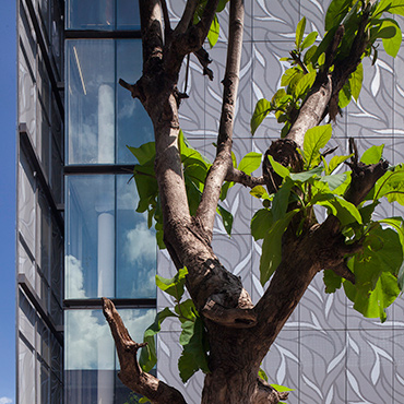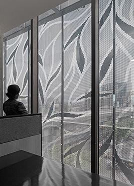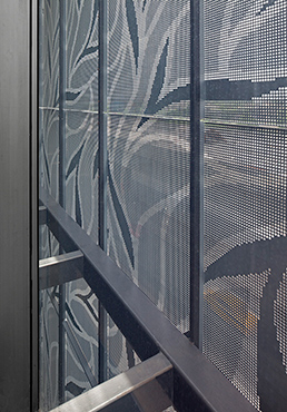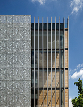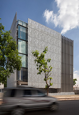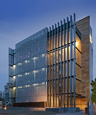 PLANNINGThe full height atrium space houses the lift lobby and the main staircase. The double skin facade comprises of a glass curtain wall and a perforated aluminium screen which assist in reducing heat gain and glare into the office space as well as provides filtered views to the outside.